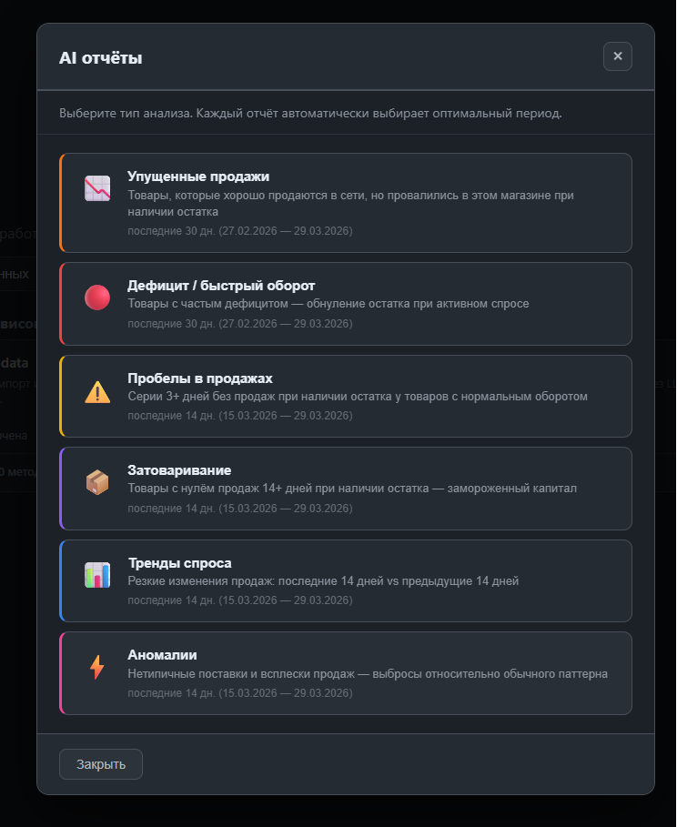 Выбираете тип отчёта: упущенные продажи, дефицит, пробелы, затоваривание, тренды или аномалии. Каждый отчёт автоматически выбирает оптимальный период анализа.
