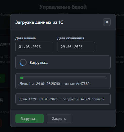 Выгружаете данные о продажах и остатках напрямую из 1С. Система принимает данные за любой период и обрабатывает десятки тысяч записей за считанные минуты.