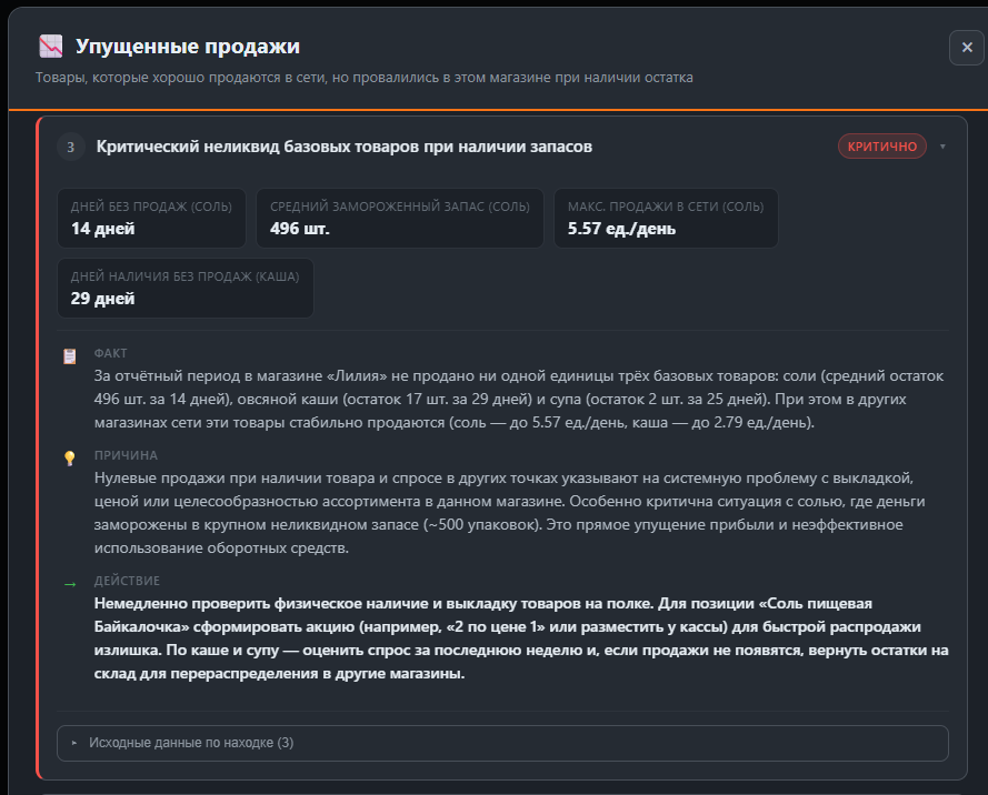 AI не просто показывает цифры — он объясняет что произошло, почему это проблема и что конкретно нужно сделать. Готовая инструкция для менеджера без дополнительного анализа.